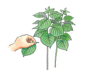 본엽 4 매부터 수확이 가능. 한꺼번에 전부 수확하면 점차 나무가 연약하게 되어 병에 걸리기 쉽다. 덜 펴진 상위 2-4 잎은 남겨두고 그 아래의 잎을 계속 수확한다.