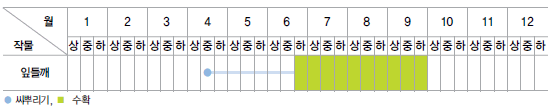 - 파종 시기 : 5월(직파 기준, 들깻잎을 목적으로 할때)