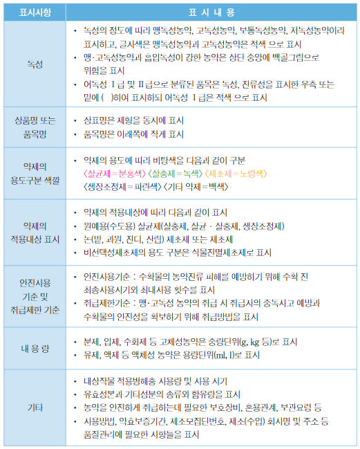 - 유효성분, 독성, 적용 작물, 대상 병충에 또는 잡초, 사용 농도, 사용량, 사용시기 및 화수와 주의사항