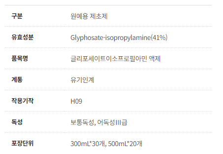 다양한 잡초를 오랫동안 방제하는 비선택성 제초제이며, 약제가 잡초의 잎을 통해 흡수된 후 생장점으로 이행되어 약효를 나타내며, 바랭이, 망초, 뚝새풀, 쑥 등 일년생과 다년생 잡초와 새, 실새풀, 청사초 등 비농경지 잡초에 효과적입니다.